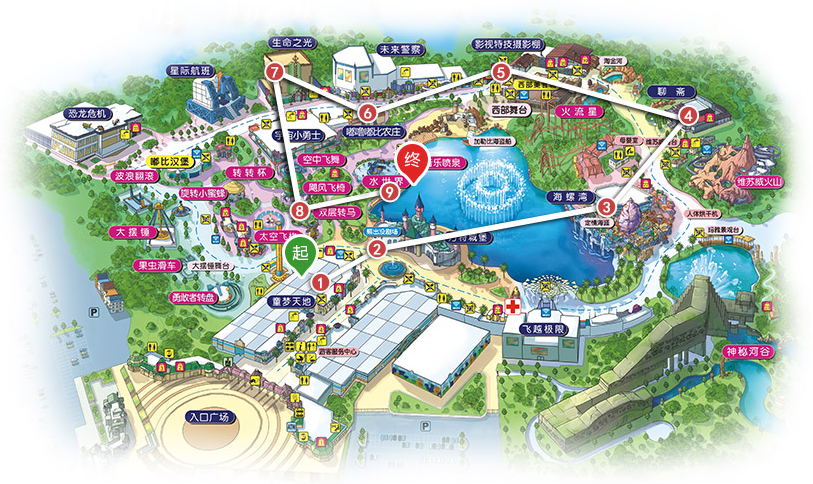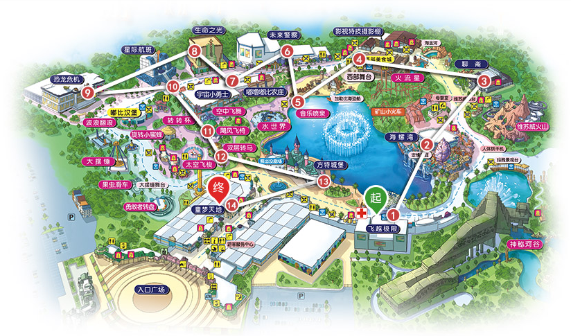 惊险之旅:(太空飞梭→勇敢者转盘→空中飞舞→飓风飞椅→大摆锤→恐龙危机→星际航班→宇宙小勇士→未来警察→火流星→维苏威火山→神秘河谷→飞越极限)