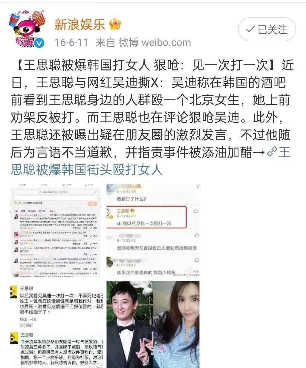 这不是王思聪第一次打人,他曾在2016年在韩国打女人,网红吴迪见义勇为反被打。吴迪把这事发到网上,王思聪叫嚣着,见吴迪一次打一次!