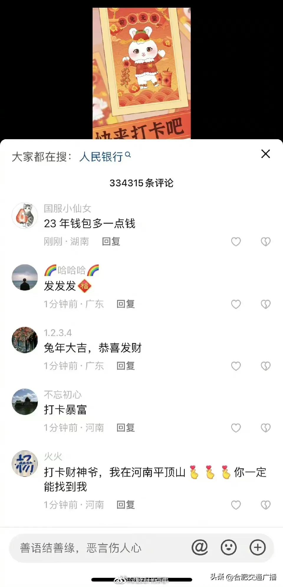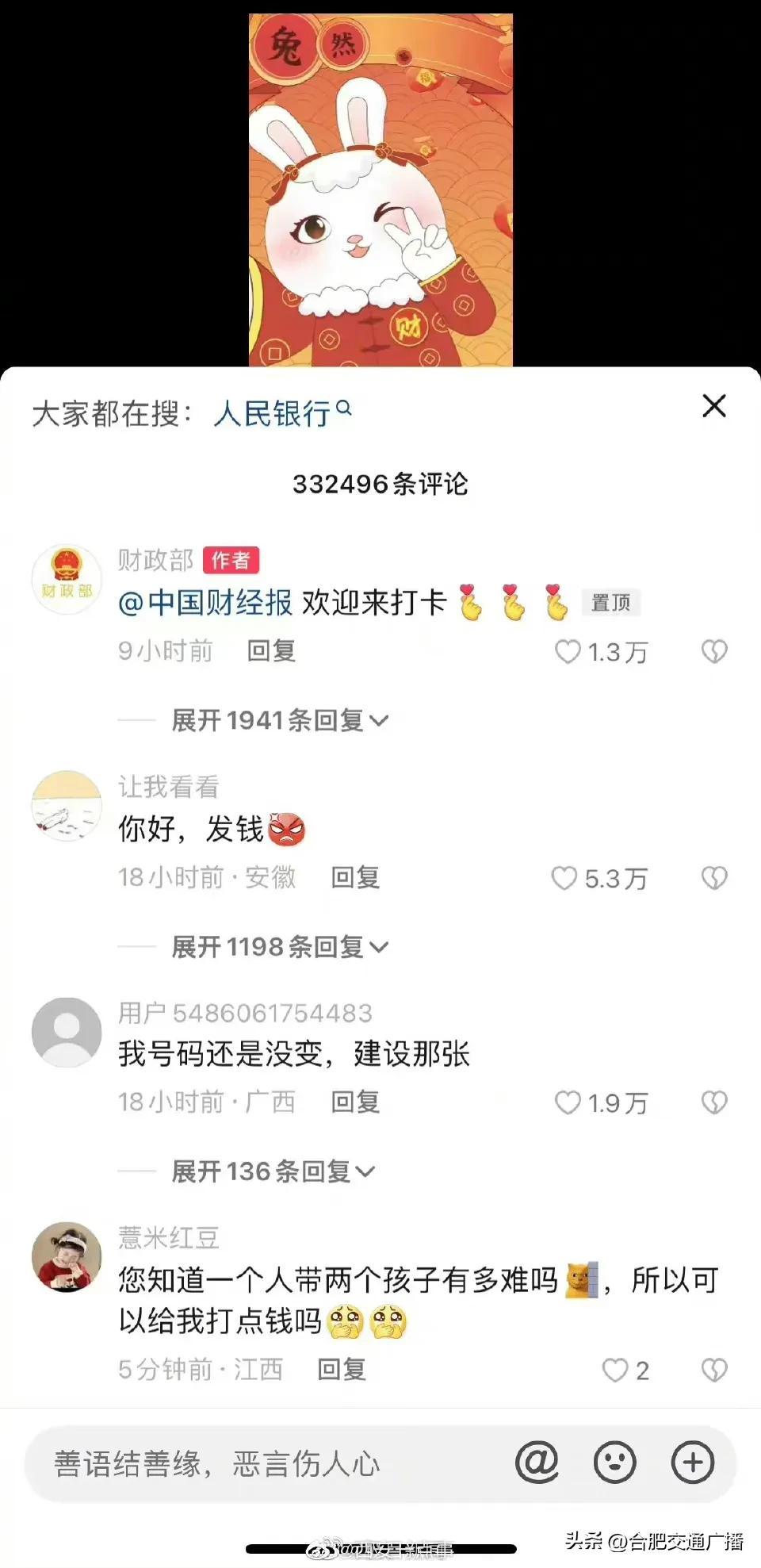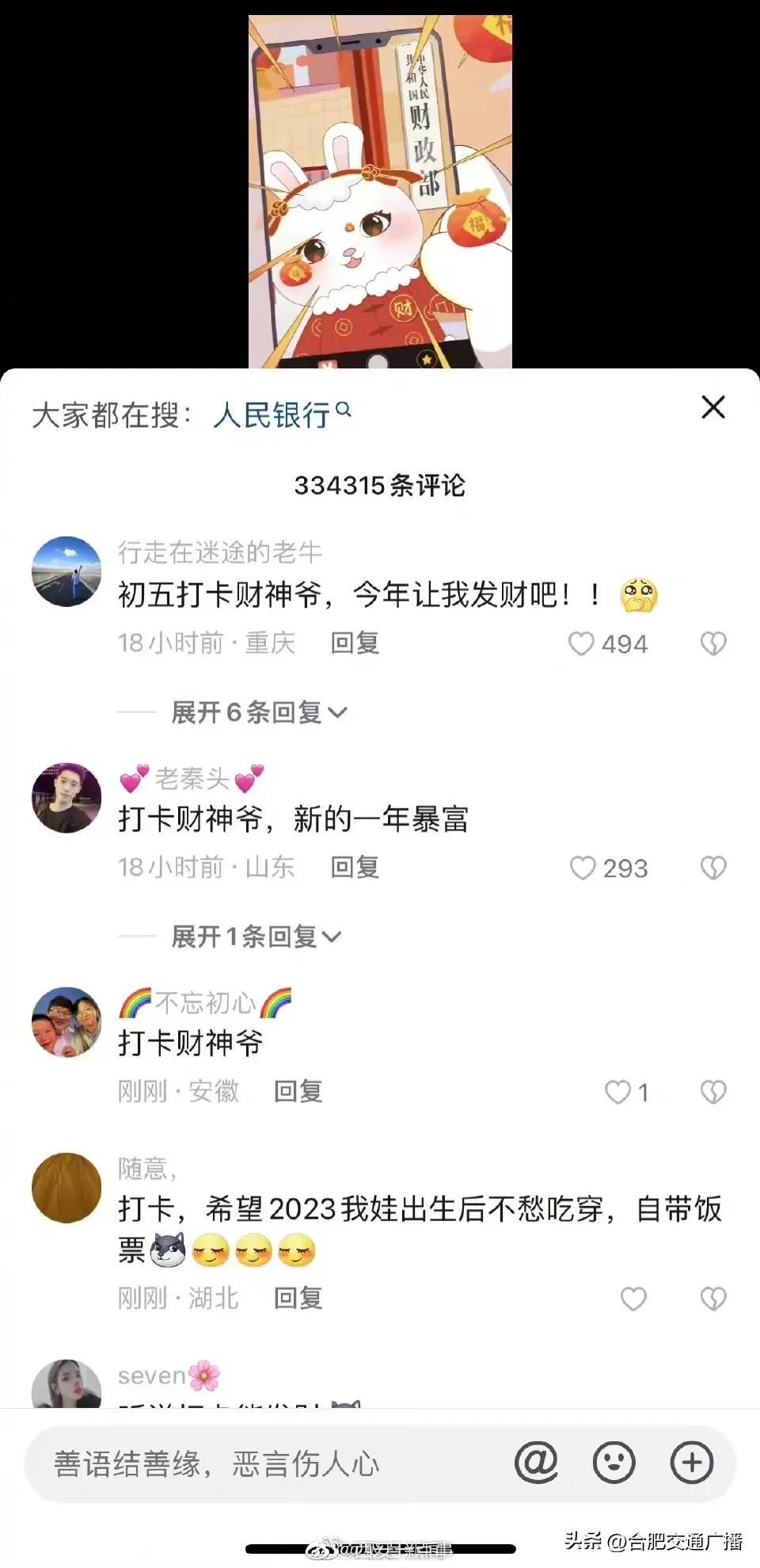 大年初五财政部账号成网友打卡地(网友纷纷给“真财神爷”花式留言) 2023-01-26 热点新闻 6808 作者:网友投稿 今天(1月26日)正月初五,是很多地方“迎财神”的日子。财政部在今天发了一条“都来打卡财政部”的动画短视频,引来网友们的点赞和转发,祈求新年“财运亨通”。